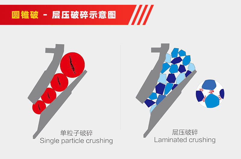 以目前在中細碎領域大顯身手的圓錐破來說,它的產品粒度較均勻、能源消耗少。但在它出場的初期并不是那么優秀,在生產中存在很多缺點,如成品針片狀含量較多、粒形不夠好。后來,針對這些問題,業界提出了層壓破碎原理,并依此進行了工藝上的改進。