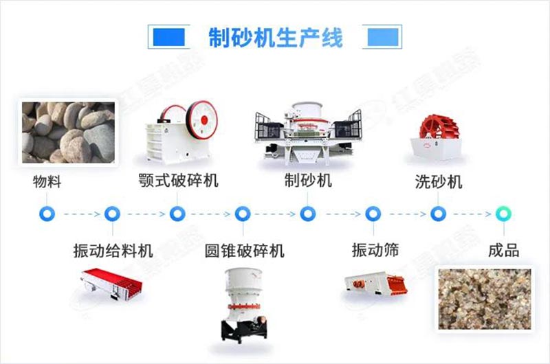 要生產高質量砂石骨料,就離不開嚴格的生產流程。一般適合公路、鐵路用的砂石料為鵝卵石、花崗巖、石灰巖等。這些大塊巖石經過給料機進入破碎設備進行初級破碎和二級破碎,經過傳輸帶進入制砂機進行細碎整形。最后經過洗砂環節,機制砂成品就生產好了。