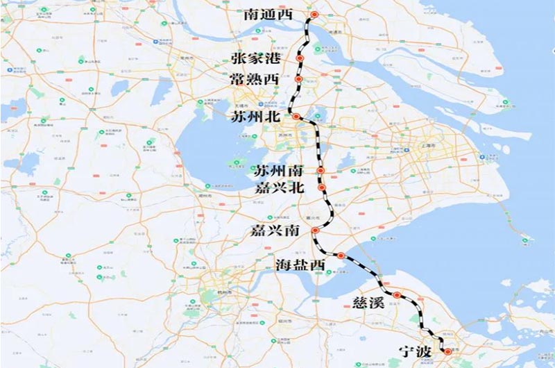 通蘇嘉甬鐵路正線運營長度310.113公里,其中新建線路300.638公里,設計時速350公里,全線估算投資1080.9億元。其中,浙江段新建線路長度165.914公里,跨海大橋長29.162公里。通蘇嘉甬鐵路設計時速350公里,預計工期5年。全線設南通西、張家港、常熟西、蘇州北、蘇州南、嘉善北、嘉興南、海鹽、慈溪、莊橋等10座車站。