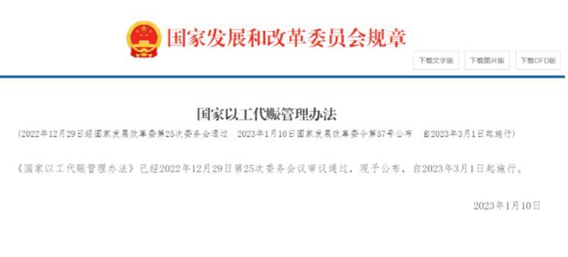 2023年1月19日,國家發改委發布《國家以工代賑管理辦法》(簡稱《辦法》),自2023年3月1日起施行。