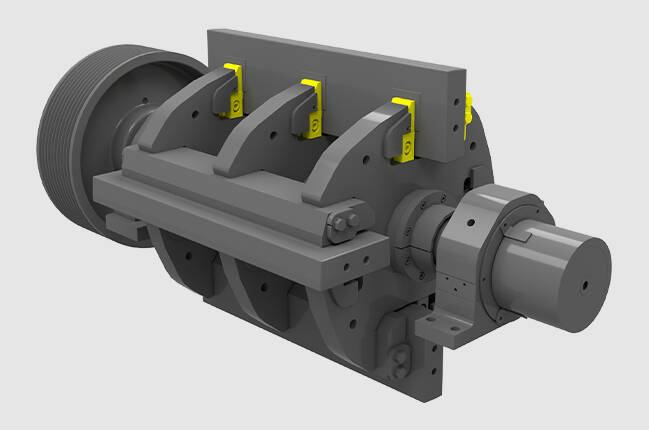 本機工作時,在電動機的帶動下轉子高速旋轉,物料進入板錘作用區時與轉子上的板錘撞擊破碎,后又被拋向反擊裝置上再次破碎,然后又從反擊襯板上彈回到板錘作用區進行重新破碎,此過程重復進行物料由大到小進入一、二、三反擊腔重復進行破碎,直到物料被破碎至所需粒度。