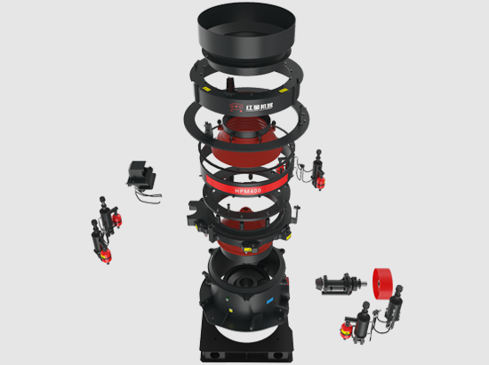 HPM多缸圓錐破碎機結(jié)構(gòu)組成主要由定錐、動錐、偏心套、傳動、機架、調(diào)整環(huán)、進料倉個排料口、鎖緊保護、油缸、風機、電機液壓等組成。